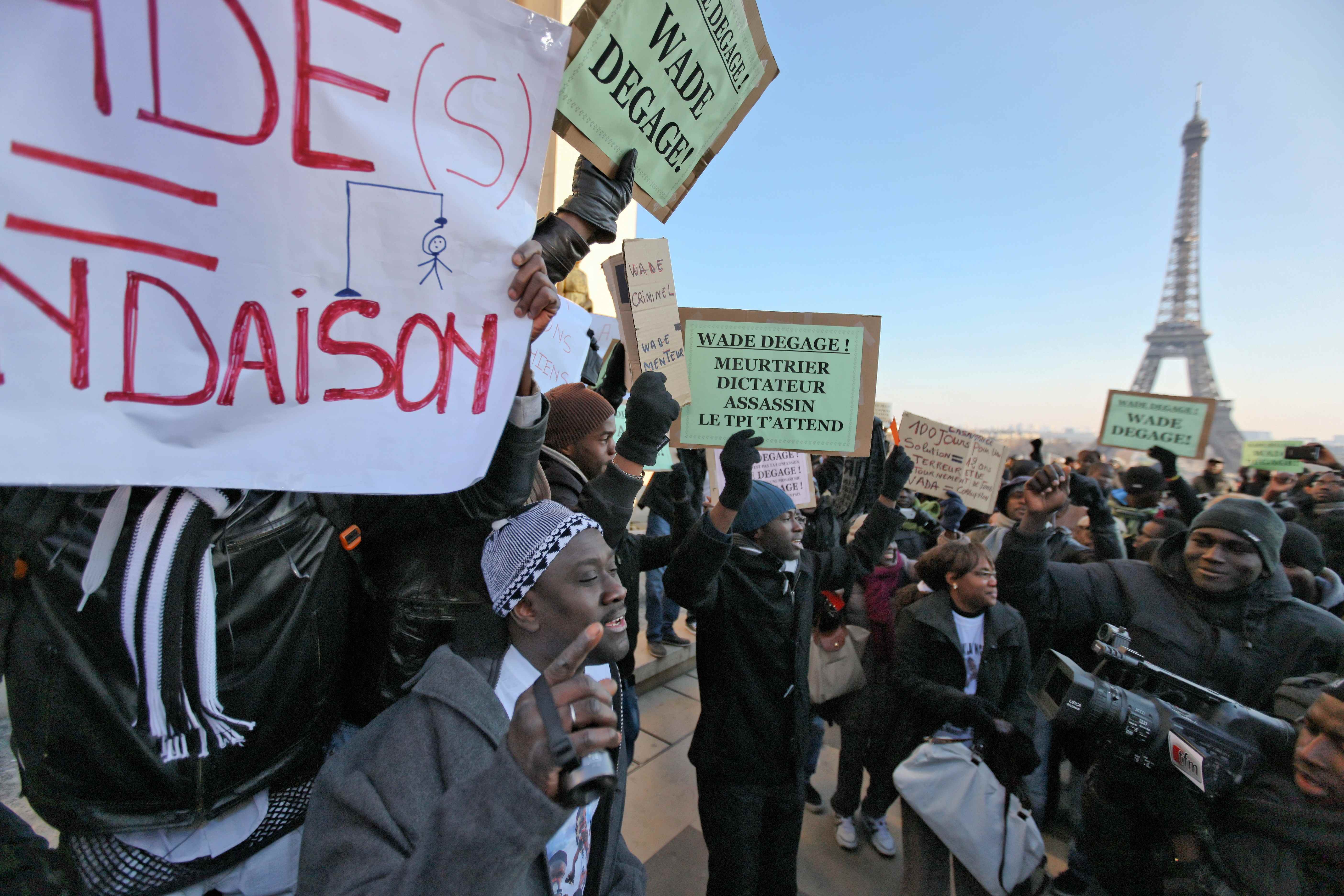 Elu en 2000 puis réélu en 2007, Abdoulaye Wade, 85 ans, se présente pour un troisième mandat de sept ans avec, face à lui, 13 candidats de l’opposition en ordre dispersé, parmi lesquels le chanteur Youssou Ndour, dont la candidature a été rejetée par le Conseil constitutionnel sénégalais. L’opposition estime que M. Wade a épuisé ses deux mandats légaux et donc que sa nouvelle candidature est un « coup d’Etat constitutionnel ». C’est pour rappeler haut et fort ce point de vue que les opposants à l’actuel Président sénégalais s’étaient donné rendez-vous le 4 février 2012 sur le parvis des Droits de l’Homme, à Paris, au pied de la Tour Eiffel.