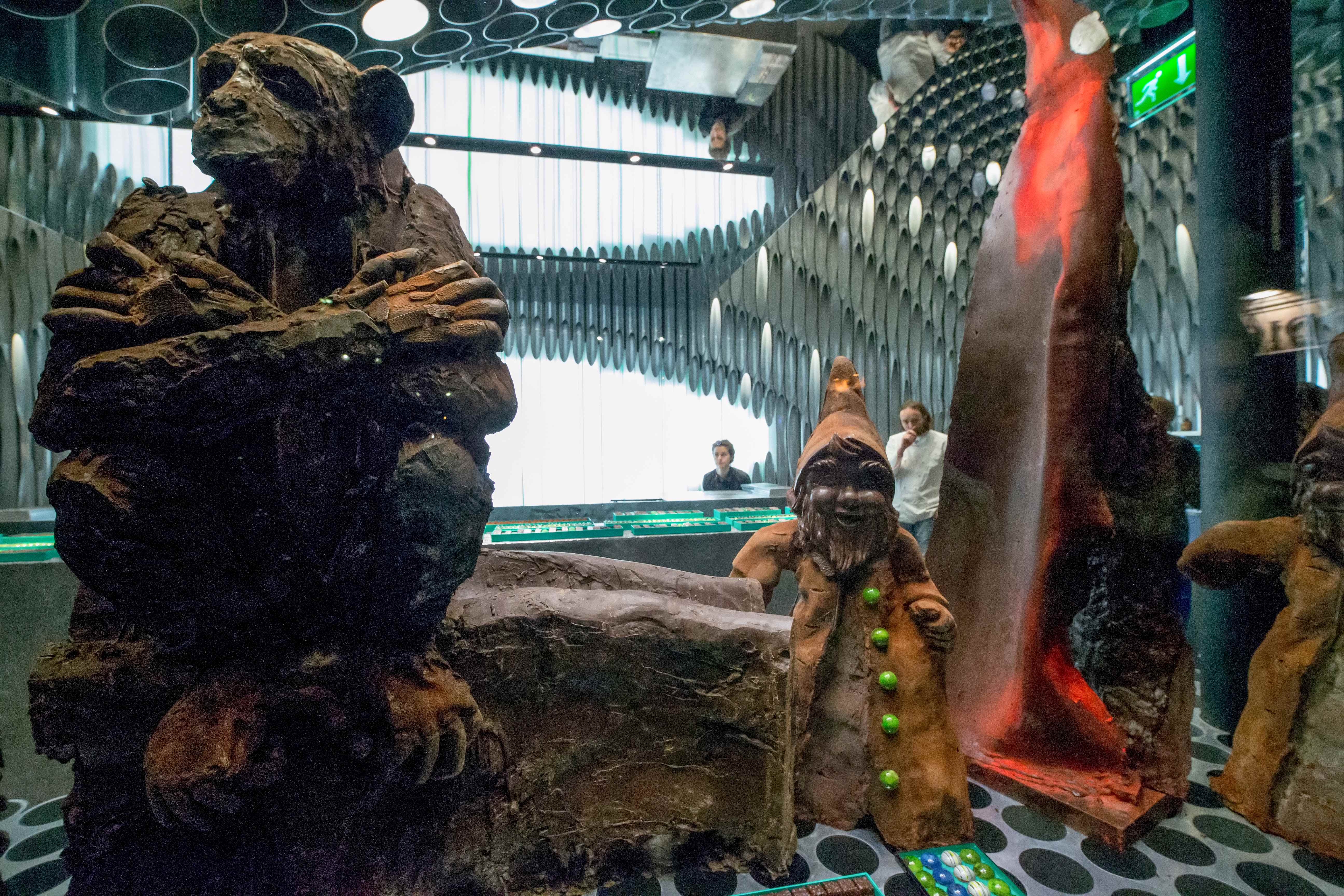 Le chocolatier Patrick Roger vient d’ouvrir sa nouvelle boutique, place de la Madeleine à Paris. Ce magasin attire l’œil des passants qui se promènent, avec ses singes de chocolat grandeur nature qui rient dans la vitrine. L’aménagement est moderne, tout de tubes d’aluminium qui forment autant d’alvéoles. L’endroit est original, un peu fou, et sorti tout droit de l’imagination du chocolatier, qui a dessiné et conçu lui-même l’espace.