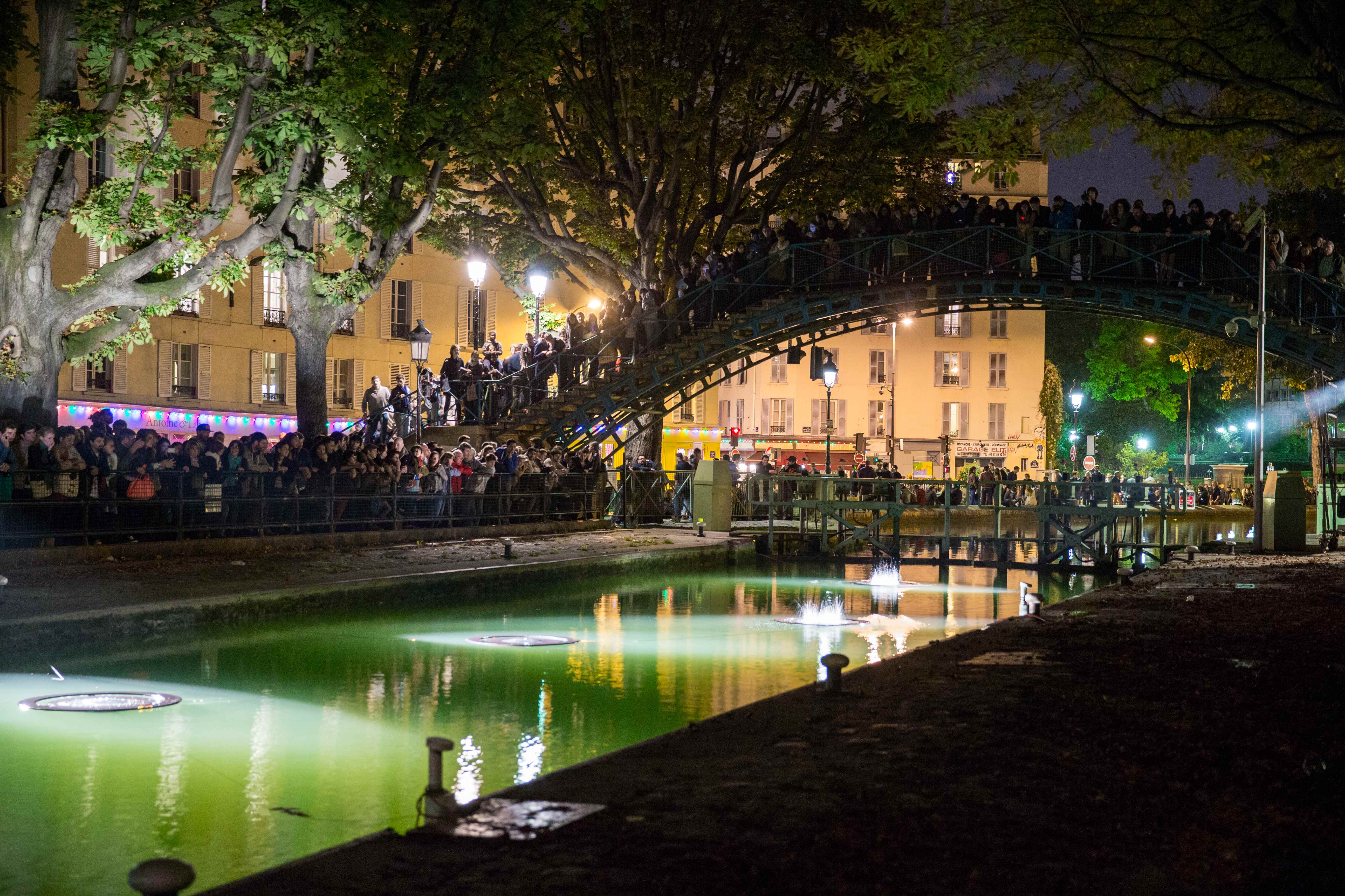 Les parisiens étaient nombreux dans la nuit du 5 au 6 octobre 2013 à arpenter les rues de Paris pour aller à la découverte des nombreuses oeuvres proposées dans le cadre de la Nuit Blanche 2013. Parmi celles-ci, la fosse d’orchestre de Rosa Barba était un dispositif sonore placé sous l’eau qui diffusait une composition de musique électronique faisant vibrer la surface des eaux du canal Saint-Martin. L’eau semblait avoir les propriétés d’une plaque sensible, le son s’y imprimant et étant révélé par le mouvement des jets d’eau.