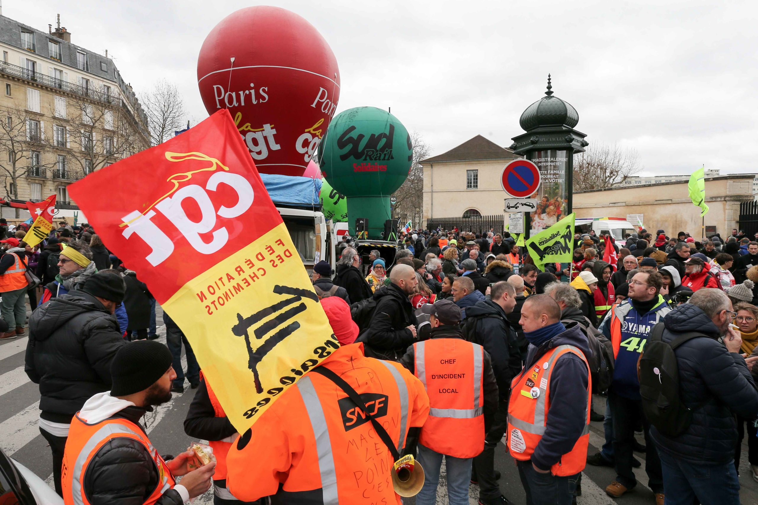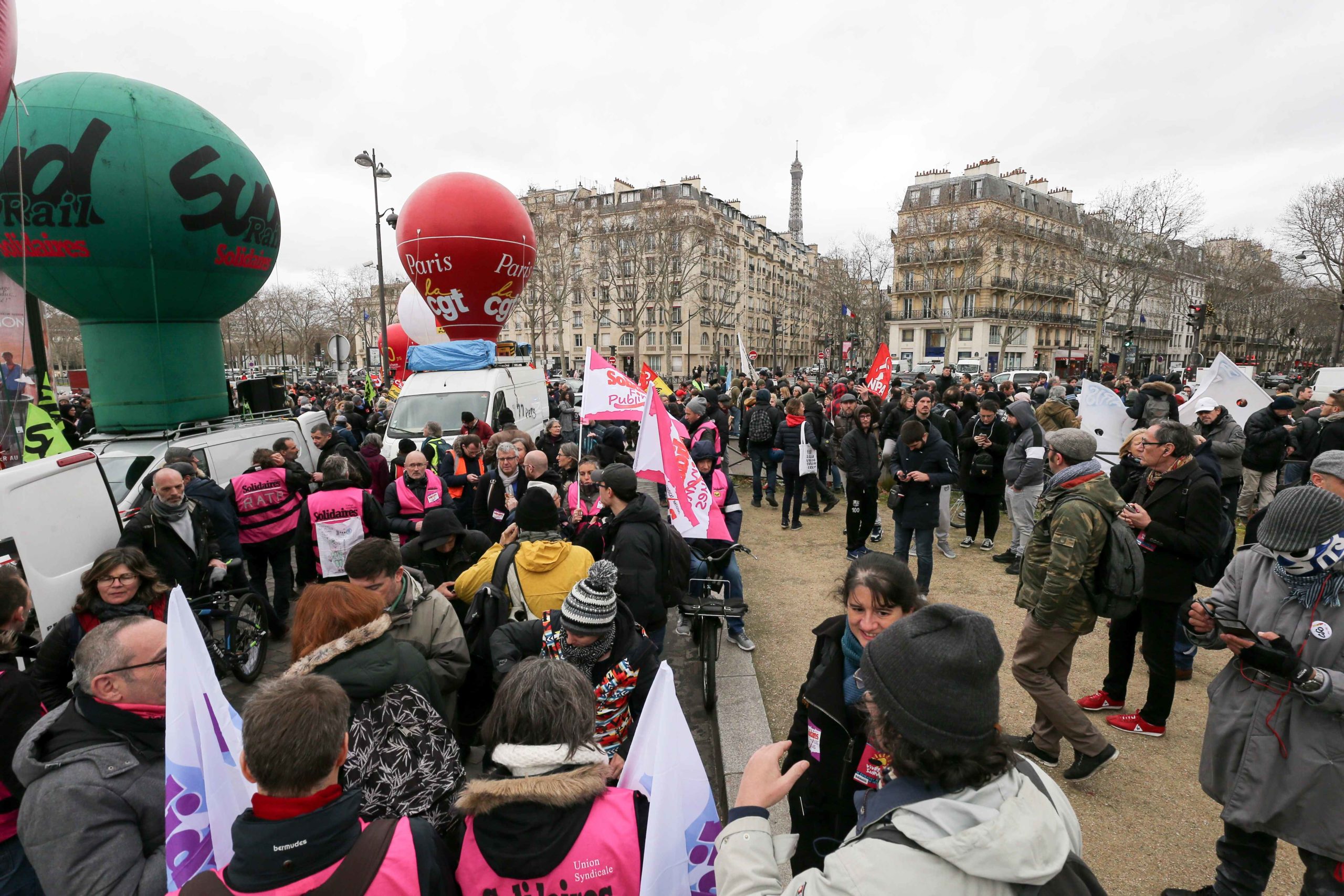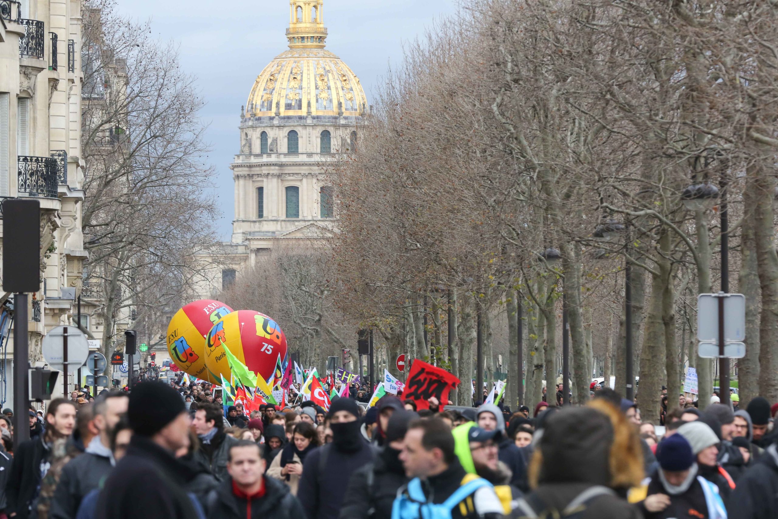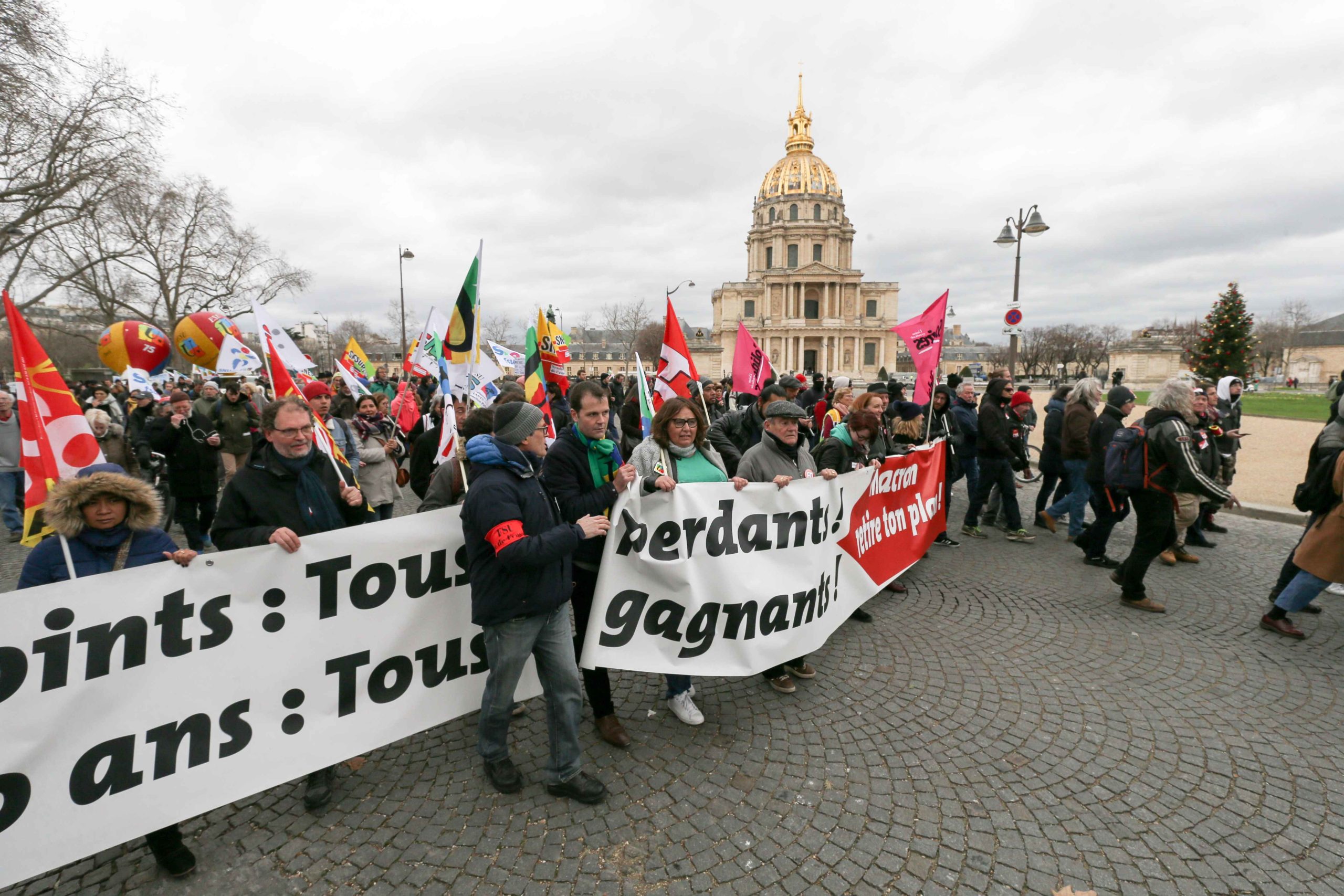 Trois jours après l’offre de compromis d’Edouard Philippe de retirer, sous conditions, l’âge pivot du projet, les manifestants marchaient derrière une banderole de tête : « Retraite par points : tous perdants ! retraite à 60 ans, tous gagnants ! Macron, retire ton plan ». Ils se sont élancés dans une atmosphère bon enfant de la place de l’École militaire peu avant 14h30.