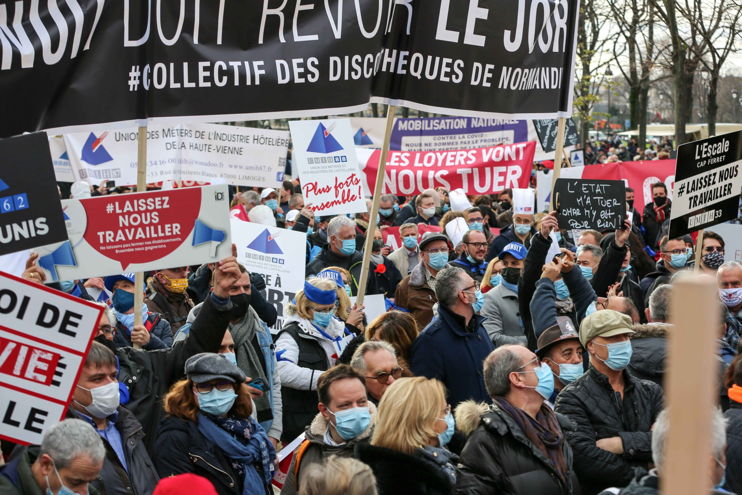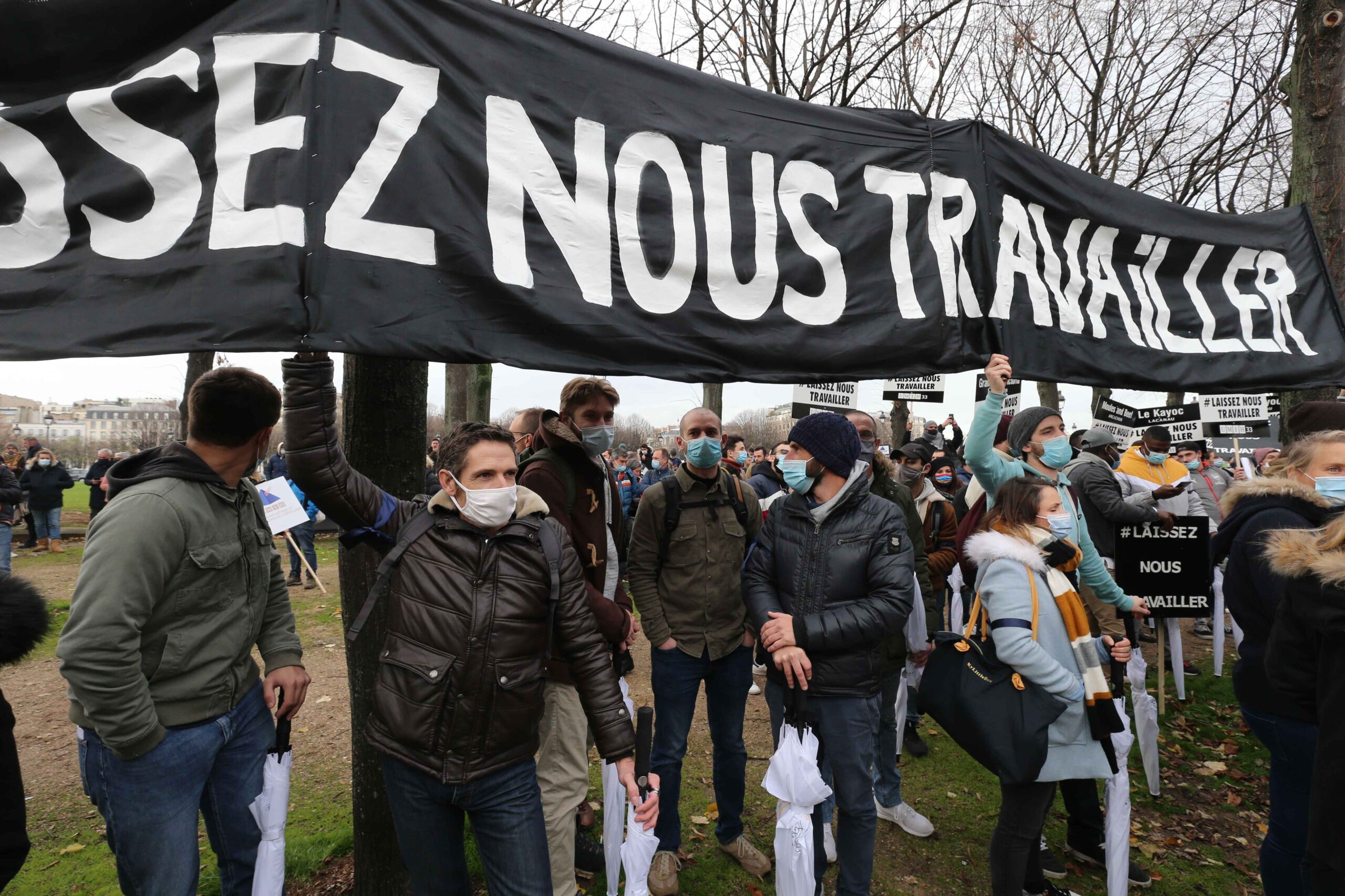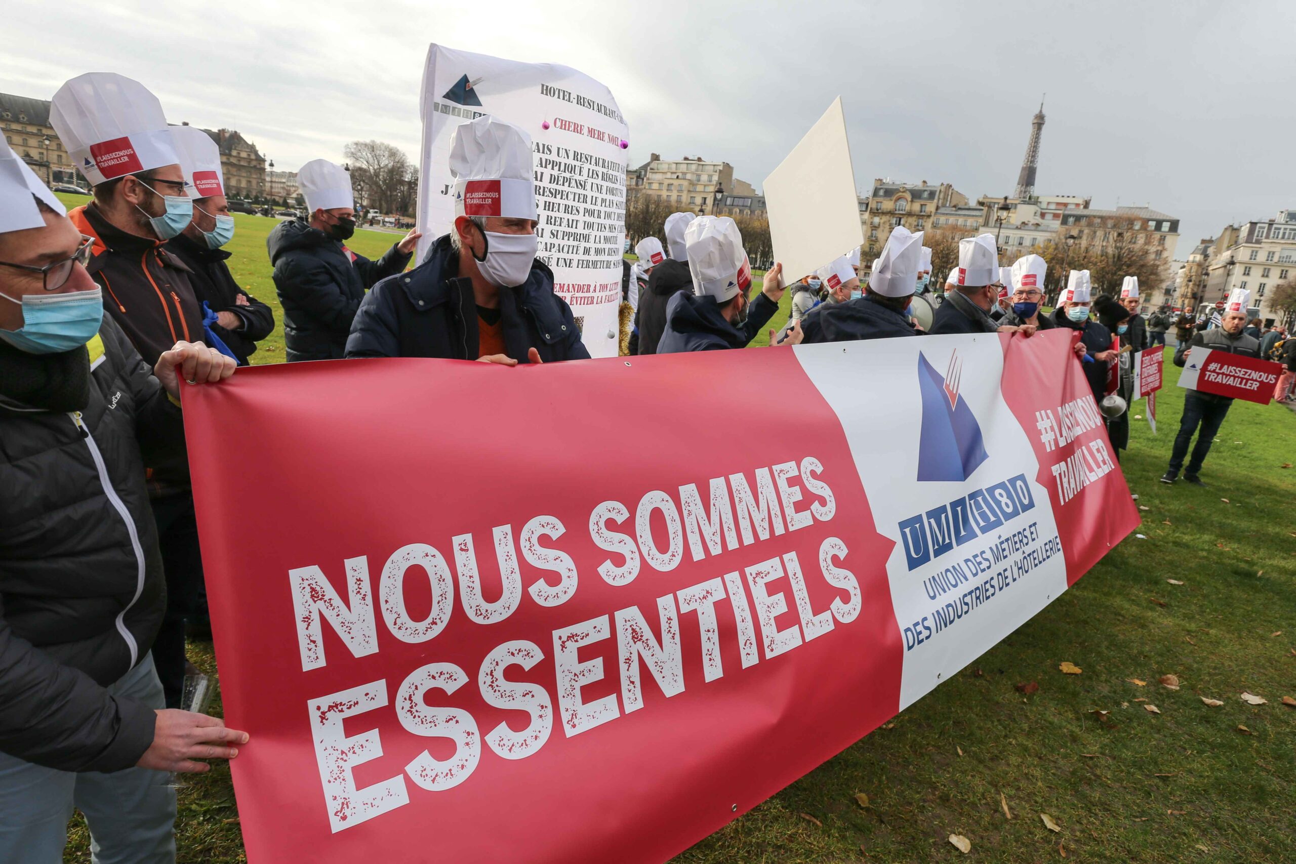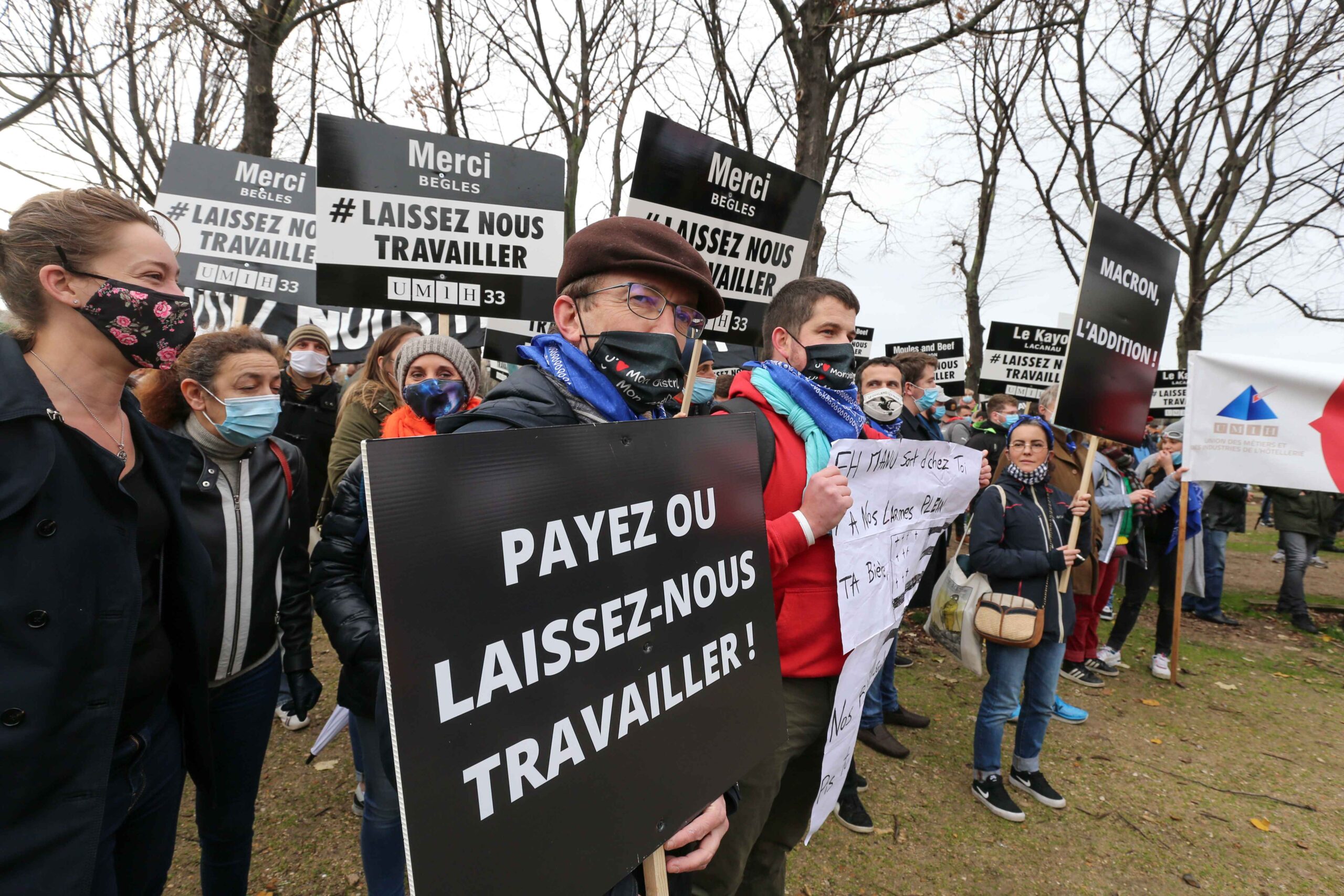 Les «professions sacrifiées» par la crise du Covid ont décidé de descendre massivement dans la rue. Ce lundi 14 décembre 2020, les gérants de restaurants, cafés, brasseries, traiteurs, hôtels, discothèques mais aussi établissements de nuit, bowlings et thalassos, venus de toute la France, ont manifesté à Paris pour réclamer la réouverture «le plus rapidement possible» de leurs établissements. Ce rassemblement, initié par l’Union des métiers et des industries de l’hôtellerie (UMIH) ainsi que le Groupement national des indépendants (GNI), a débuté vers 13 heures, sur l’esplanade des Invalides. Les prestataires ainsi que les fournisseurs (brasseurs, viticulteurs, agriculteurs, métiers de bouche, primeurs, blanchisseurs…) étaient aussi représentés.