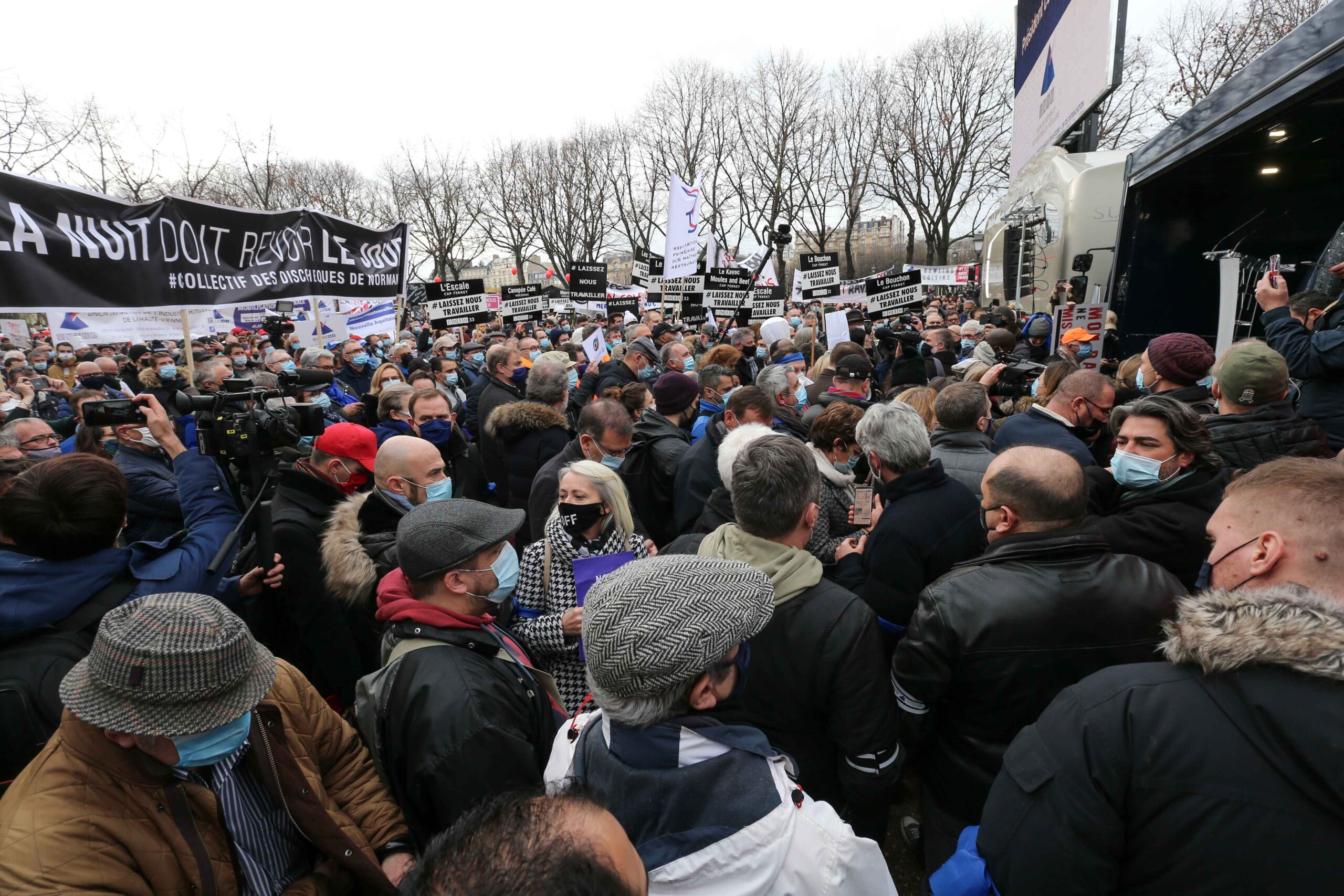 Un peu plus loin sur l’esplanade des Invalides, les représentants des syndicats se sont exprimés tour à tour devant une foule de manifestants. «Aujourd’hui nous sommes réunis et nous parlons au nom de 300.000 entreprises et de 2 millions d’emplois», a déclaré Roland Heguy, président confédéral de l’Umih. Tous ont témoigné de leur incompréhension face à la décision du gouvernement de ne pas rouvrir bars et restaurants: «On nous fait passer pour ceux qui favorisent le développement des clusters. Mais comment est-ce possible alors que nous sommes fermés depuis tant de semaine ?» a soulevé Roland Heguy.