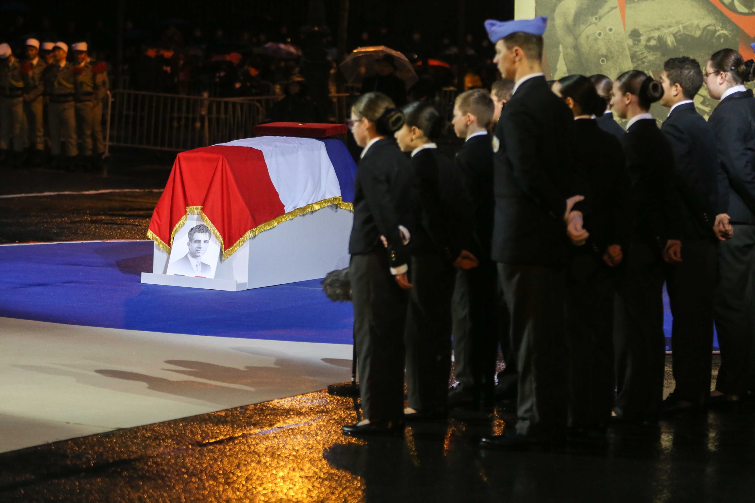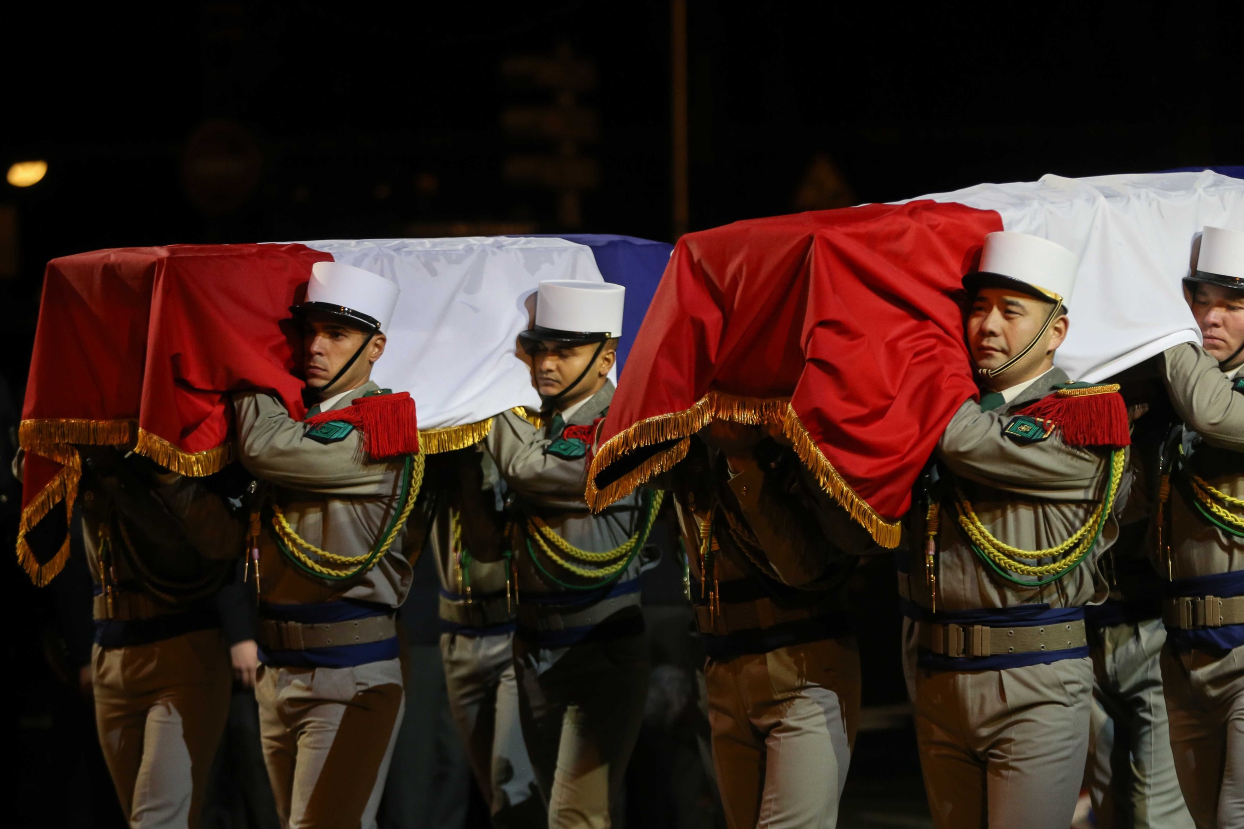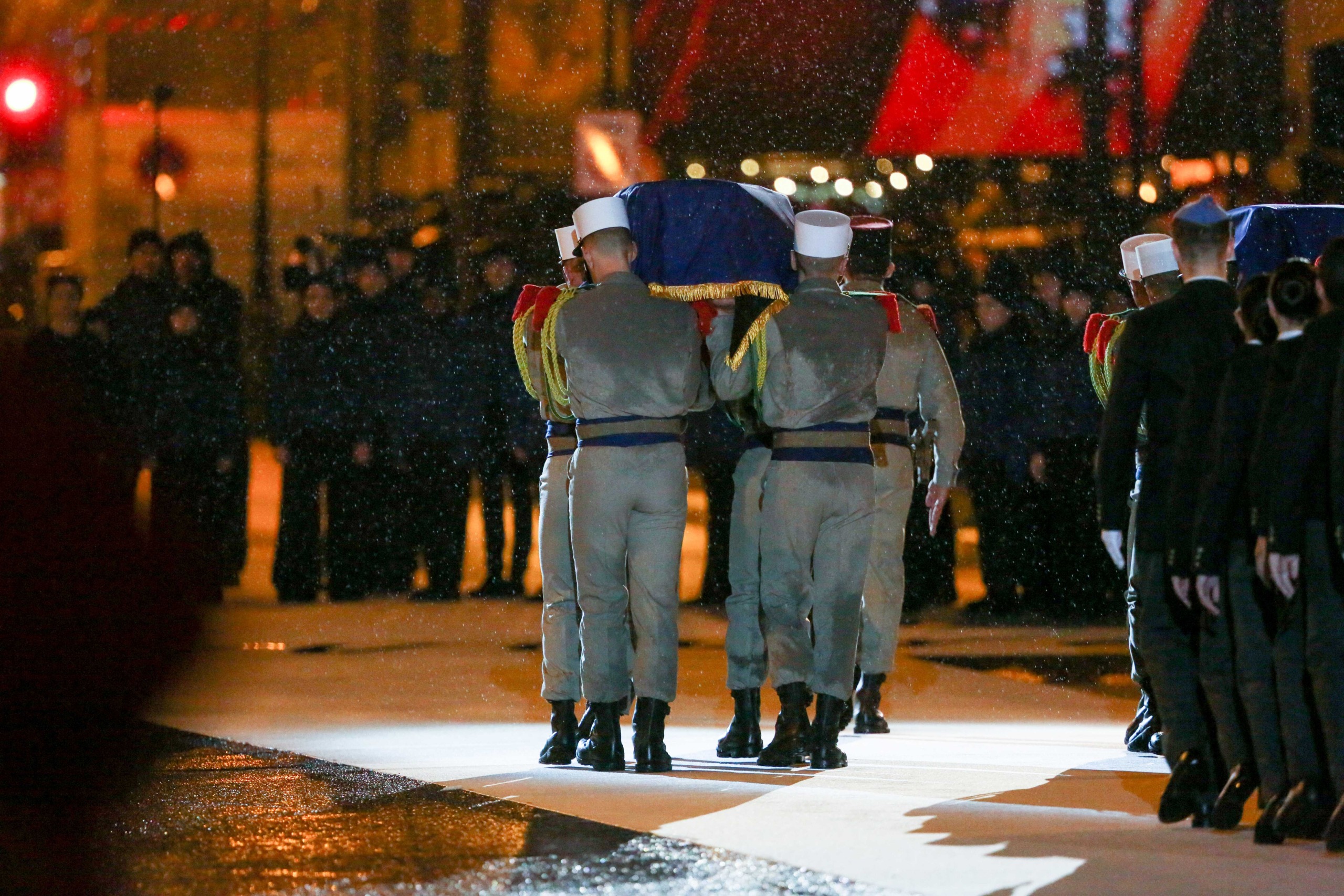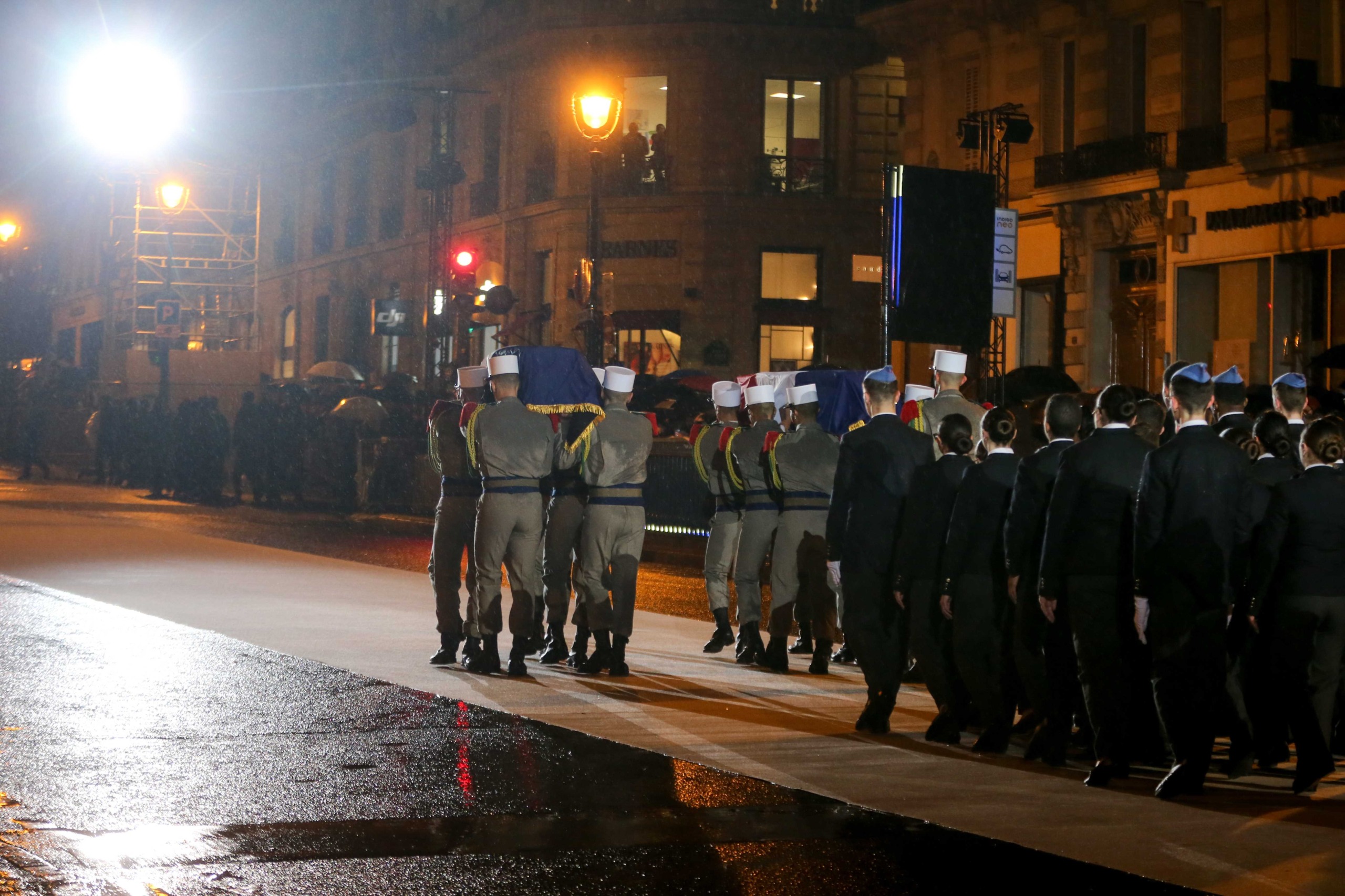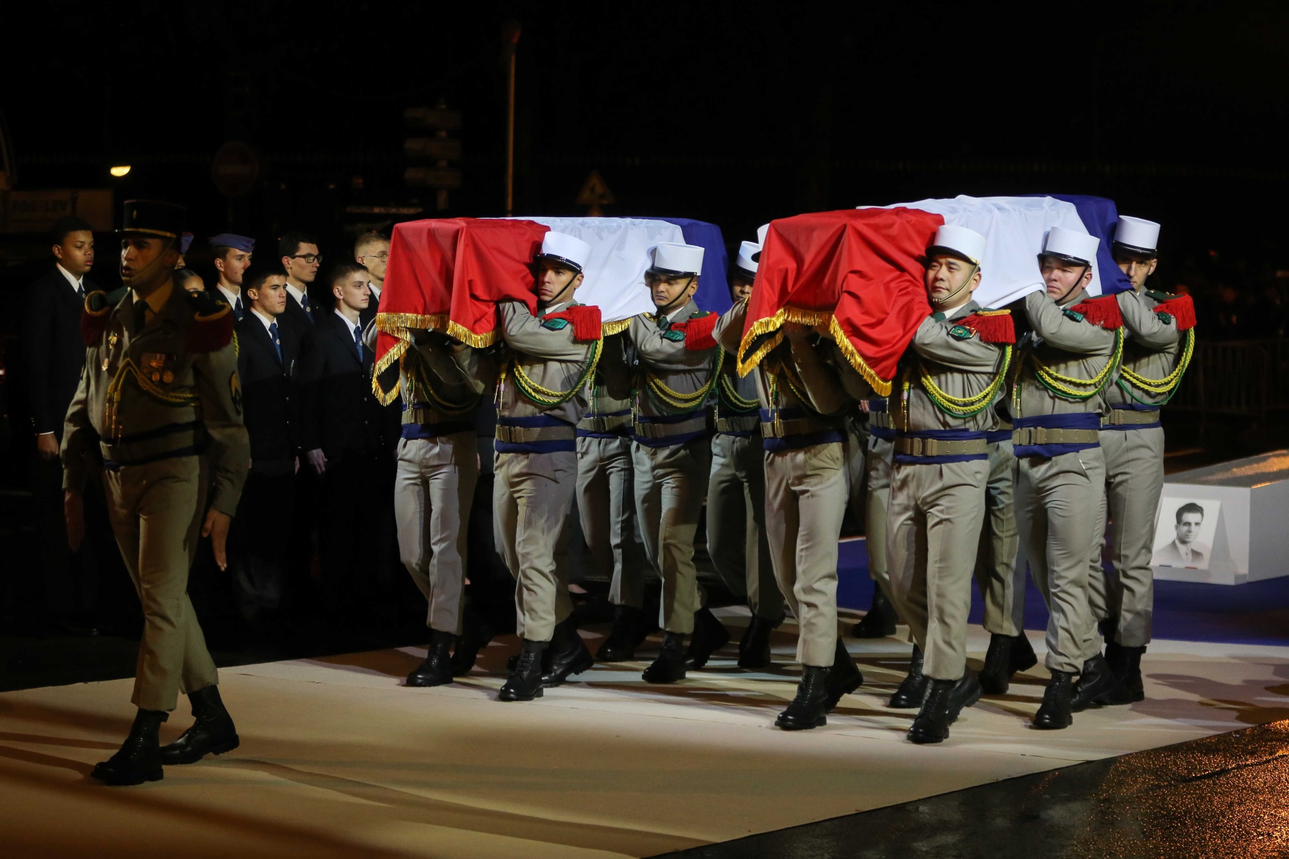 Aux alentours de 18h45, les deux cercueils ont entamé leur trajet vers le Panthéon, le long de la rue Soufflot, portés par 14 membres de la Légion étrangère. Le début du trajet a été marqué par une interprétation du morceau Ils sont tombés, de Charles Aznavour, par 90 enfants de la chorale de la maîtrise populaire de l’Opéra-comique.