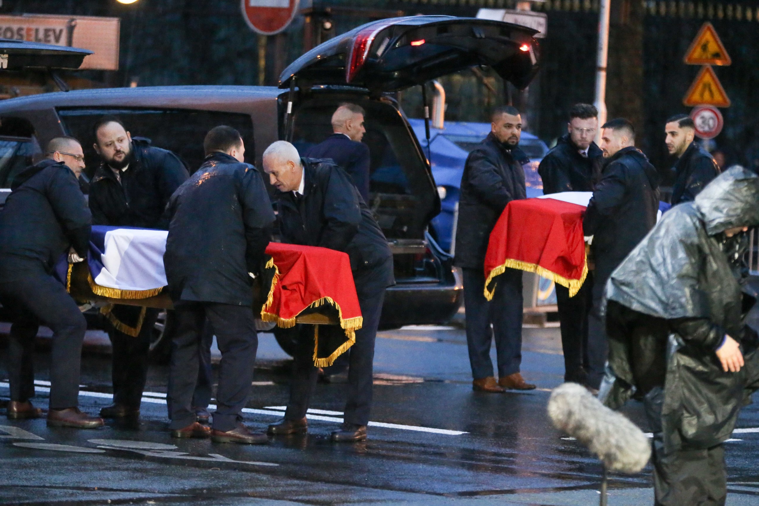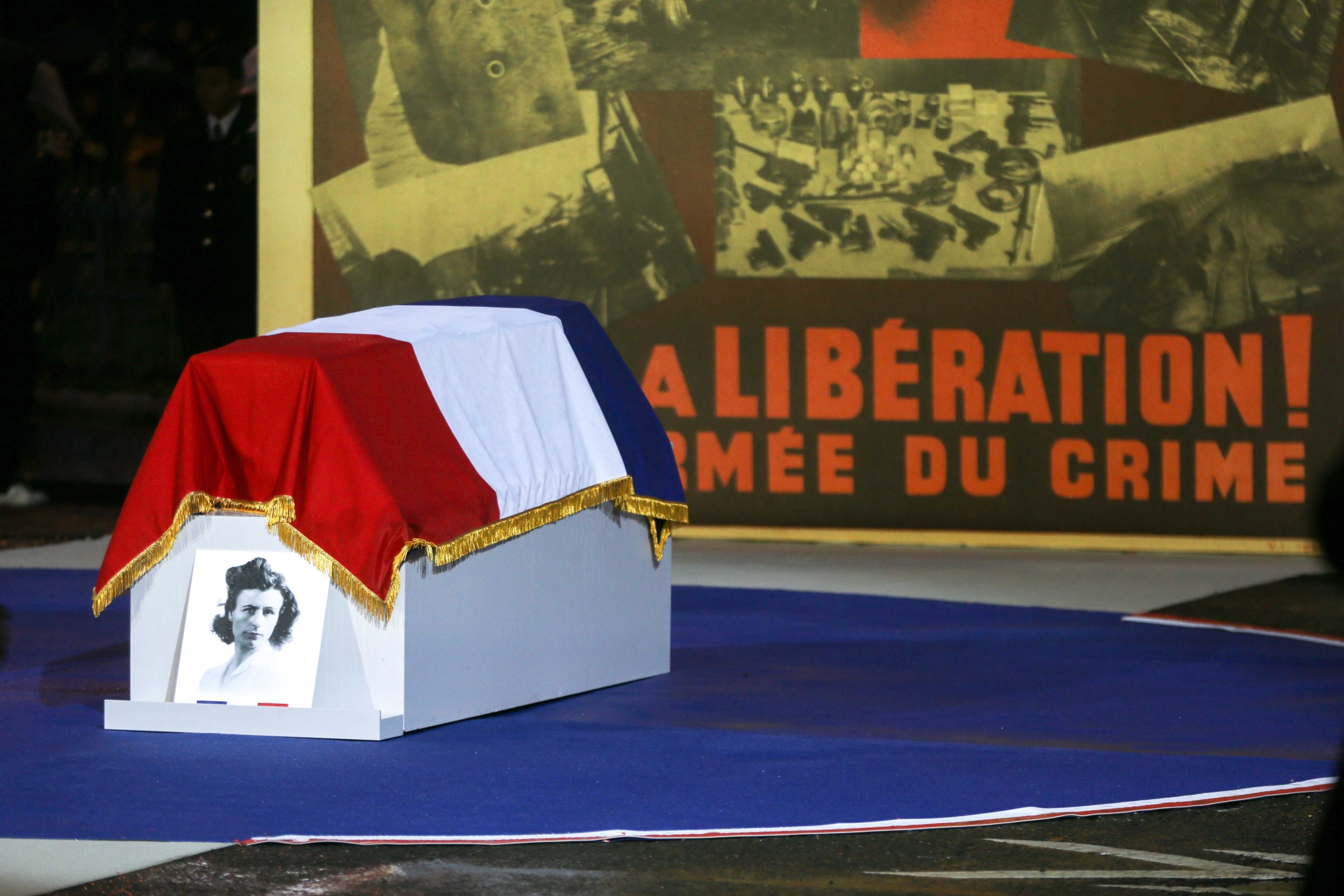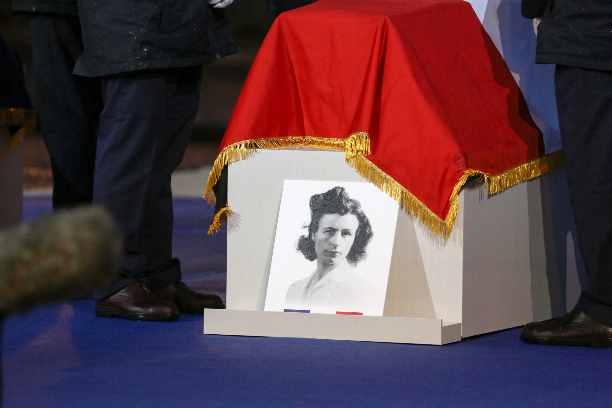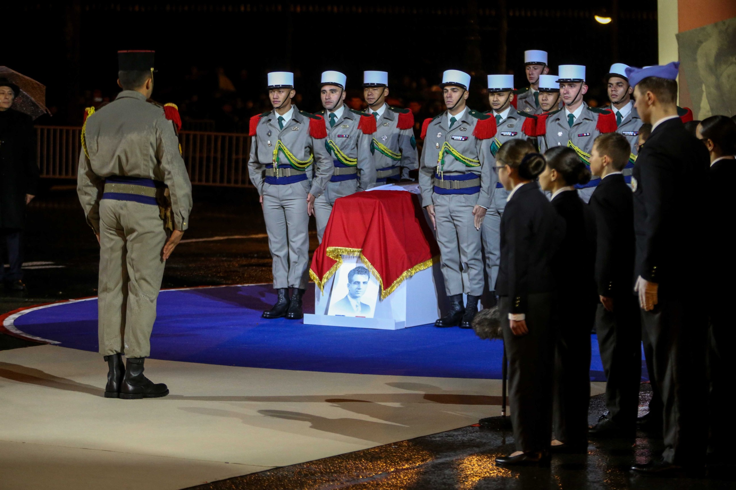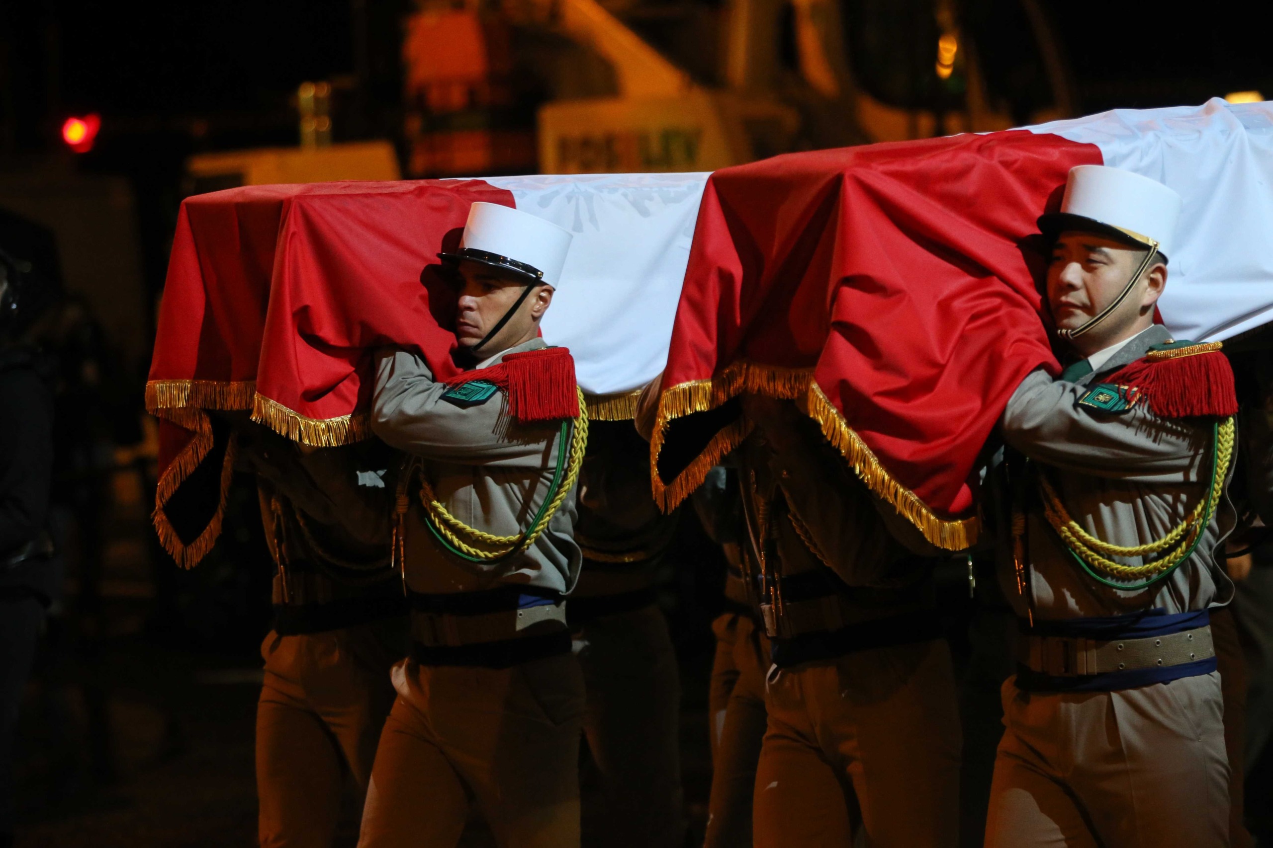 Aux alentours de 18h45, les deux cercueils ont entamé leur trajet vers le Panthéon, le long de la rue Soufflot, portés par 14 membres de la Légion étrangère. Le début du trajet a été marqué par une interprétation du morceau Ils sont tombés, de Charles Aznavour, par 90 enfants de la chorale de la maîtrise populaire de l’Opéra-comique.